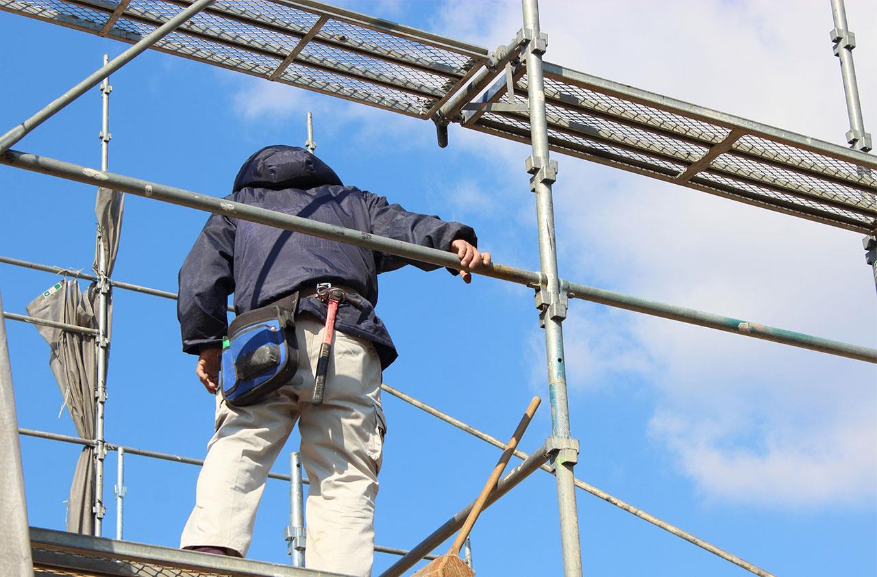 足場工事とは、外壁塗装や屋根塗装など、通常では手が届かない部分での作業が必要な際に建物の周囲に作業用の足場を設置して、安心・安全に作業できる環境をつくることを言います。